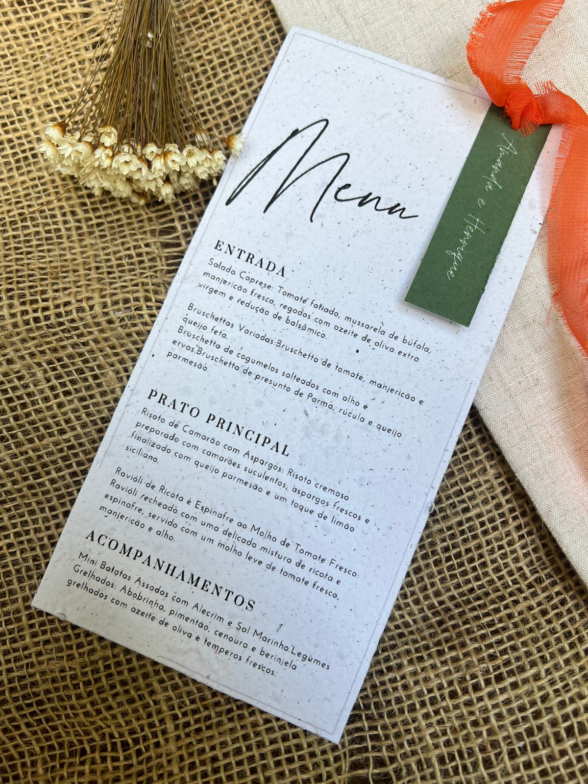 Apresentamos nosso encantador menu de casamento 9.5x20cm em papel Plantável, uma opção eco-friendly e memorável para o seu grande dia. Este menu é feito com papel reciclado contendo sementes, permitindo que após o uso, você plante e cultive belas plantas como lembrança do seu casamento.